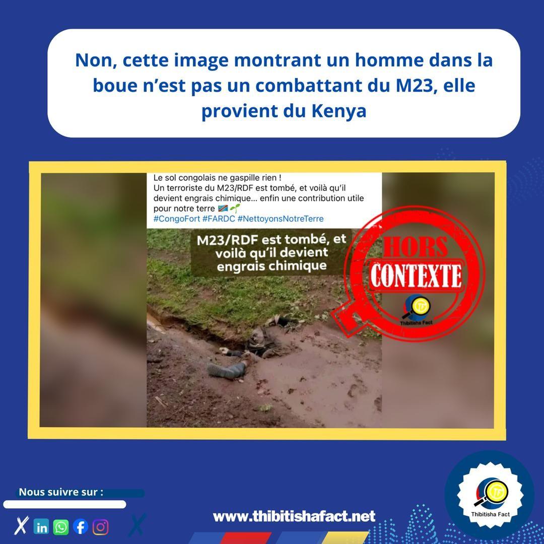 Même une image réelle peut être utilisée pour véhiculer de fausses informations. Il suffit parfois de la présenter dans un autre contexte, de la lier à un lieu ou un événement erroné, pour créer une interprétation trompeuse. Dans le cas présent, une photo d’un homme coincé dans la boue au Kenya a été présentée comme un combattant du M23 tombé au front en RDC, détournant ainsi son sens.